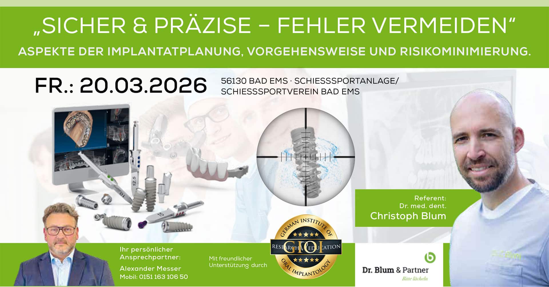 - ➡ Mit strukturierter Planung zu sicherem Implantieren und weniger Fehlern – praxisnahe Theorie – Dr. med. dent. Christoph Blum