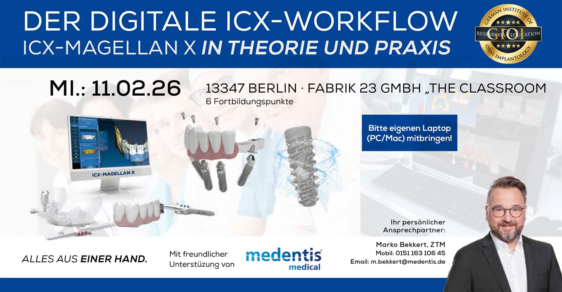 Veranstaltungsort: FABRIK 23 GMBH „THE CLASSROOM“ GERICHTSTRASSE 23/HOF 4/AUFGANG 4 13347 BERLIN LERNEN SIE DIE ZUKUNFT DER DIGITALEN IMPLANTOLOGIE KENNEN. Liebe Chirurgen, MKG´s und Implantologisch tätige Zahnärzte, lernen Sie unsere moderne ICX-MAGELLAN X-Planungs-Software kennen, welche Ihnen neue Möglichkeiten für Ihre...